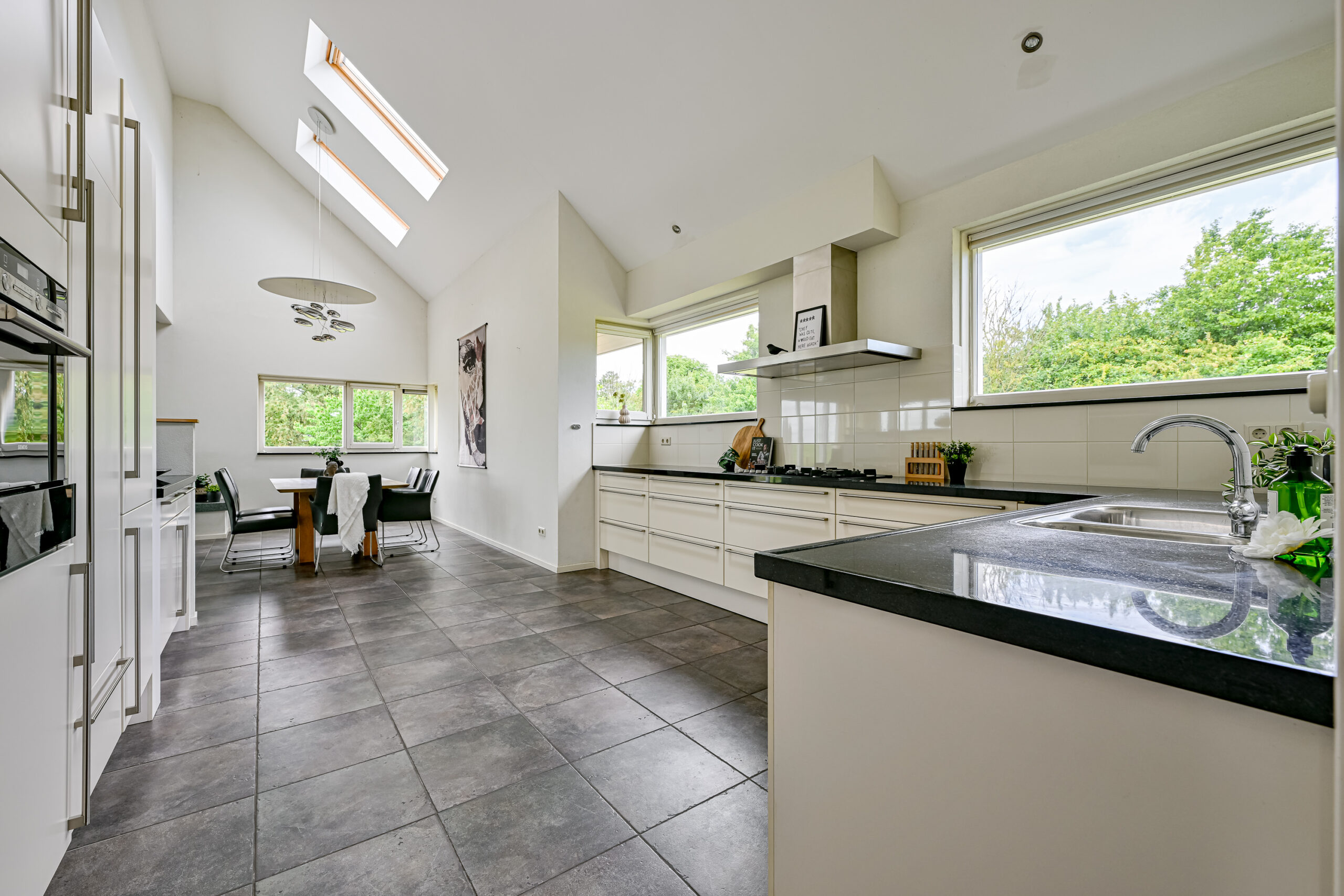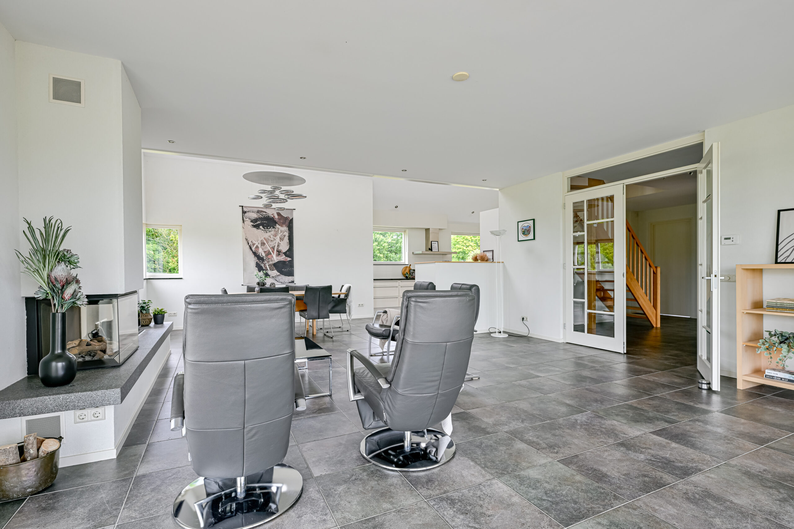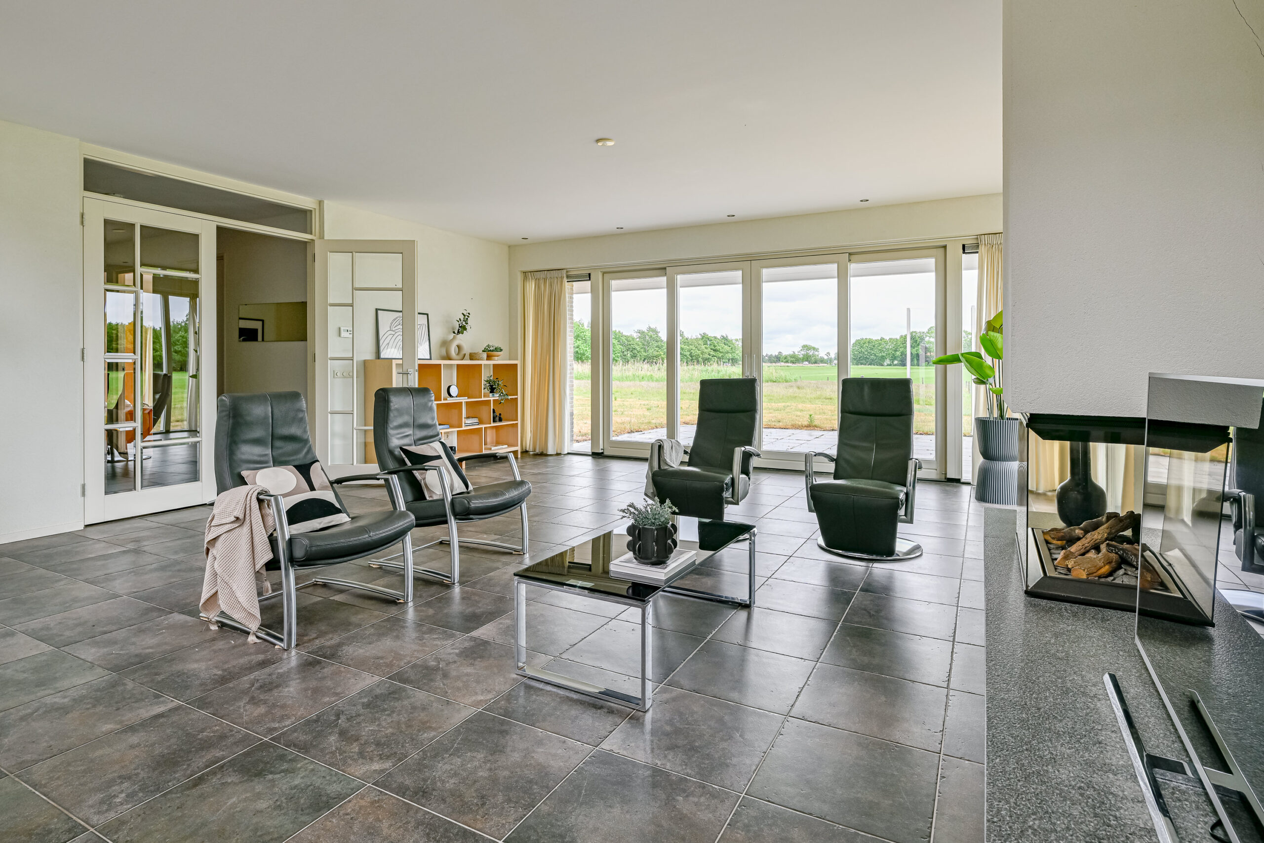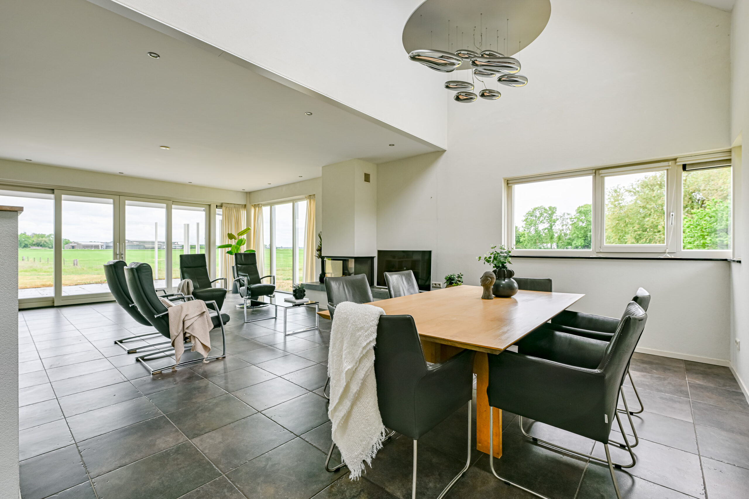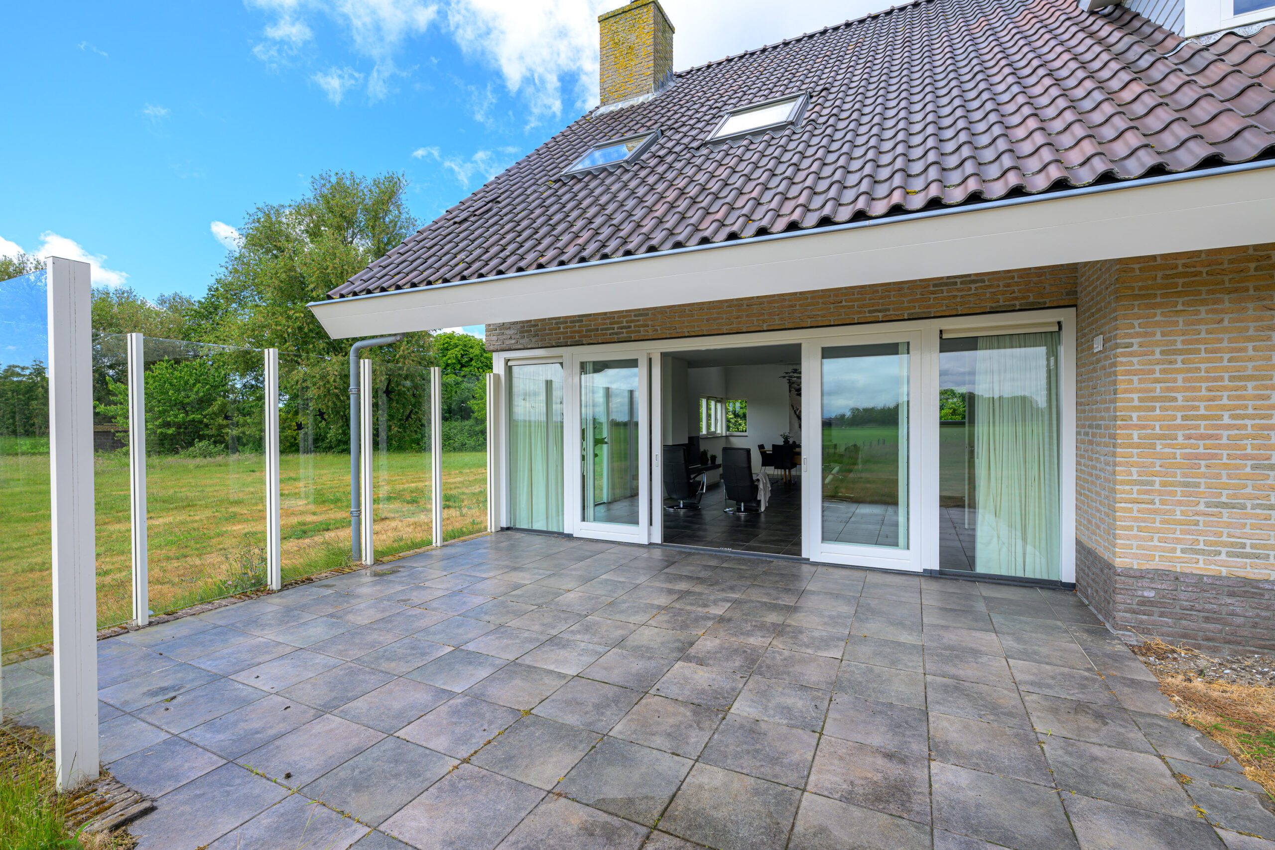 De woonkamer is heerlijk licht en heeft met grote raampartij aan de achterzijde fabelachtig uitzicht over de landerijen. De vide, die in de riante woonkeuken doorloopt geeft dit huis haar extra charme. Ook in de keuken valt de fraaie lichtinval op en de keuken is voorzien van alle nodige inbouwapparatuur. De begane grond is voorzien van vloerverwarming.