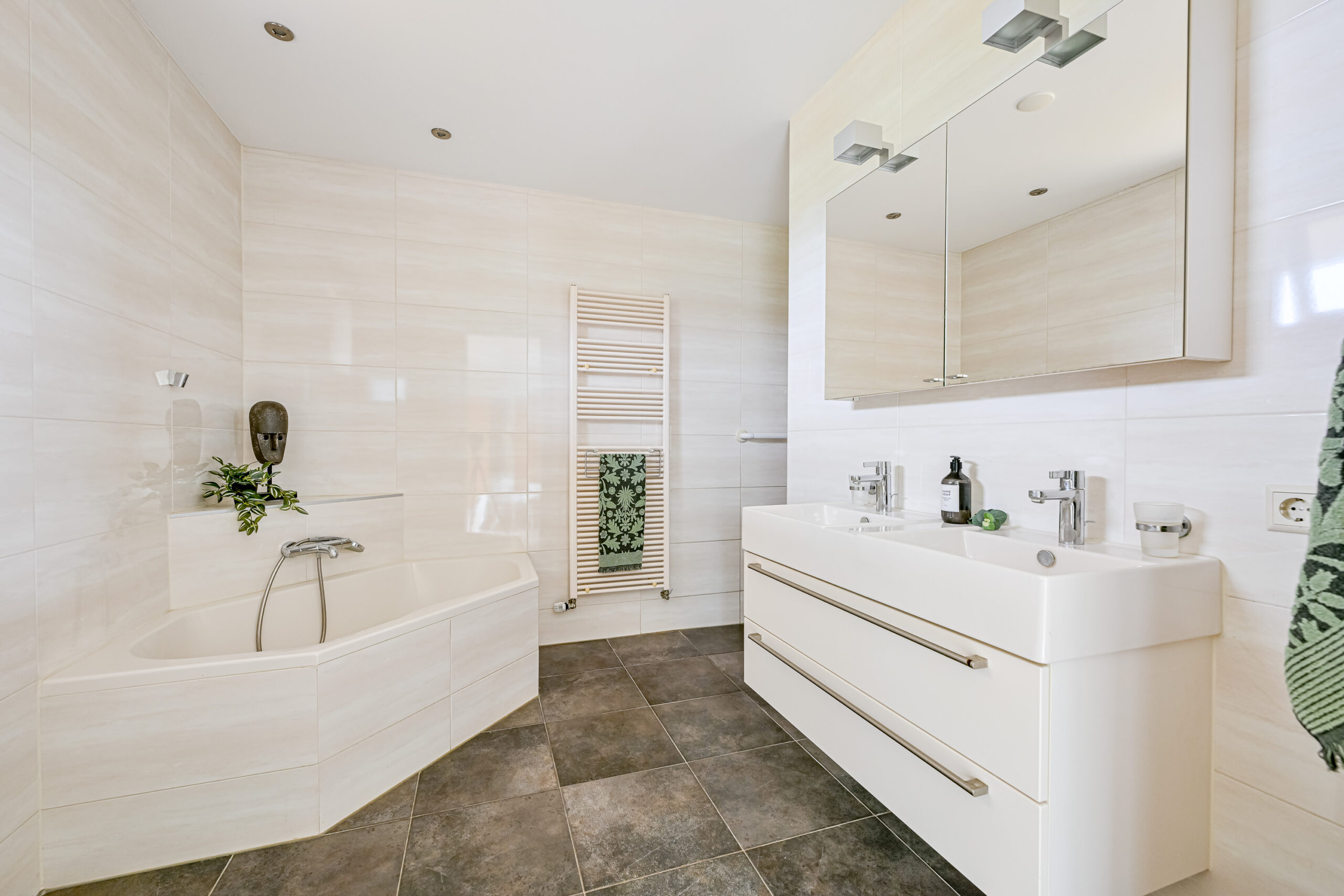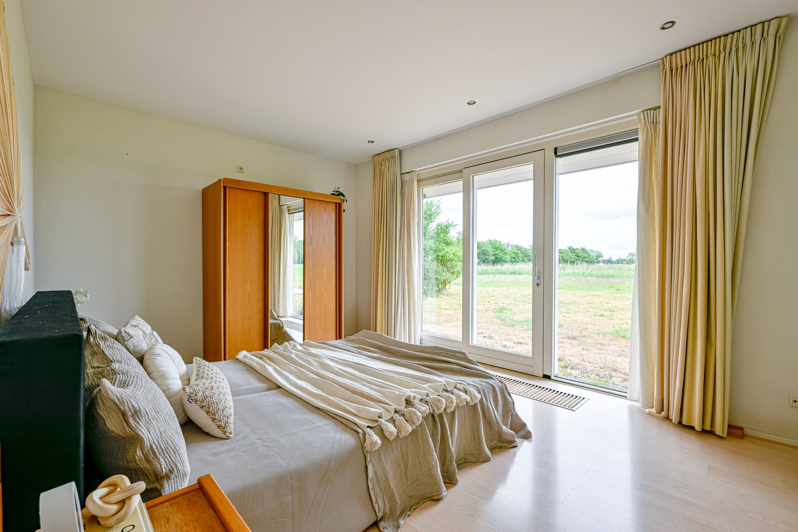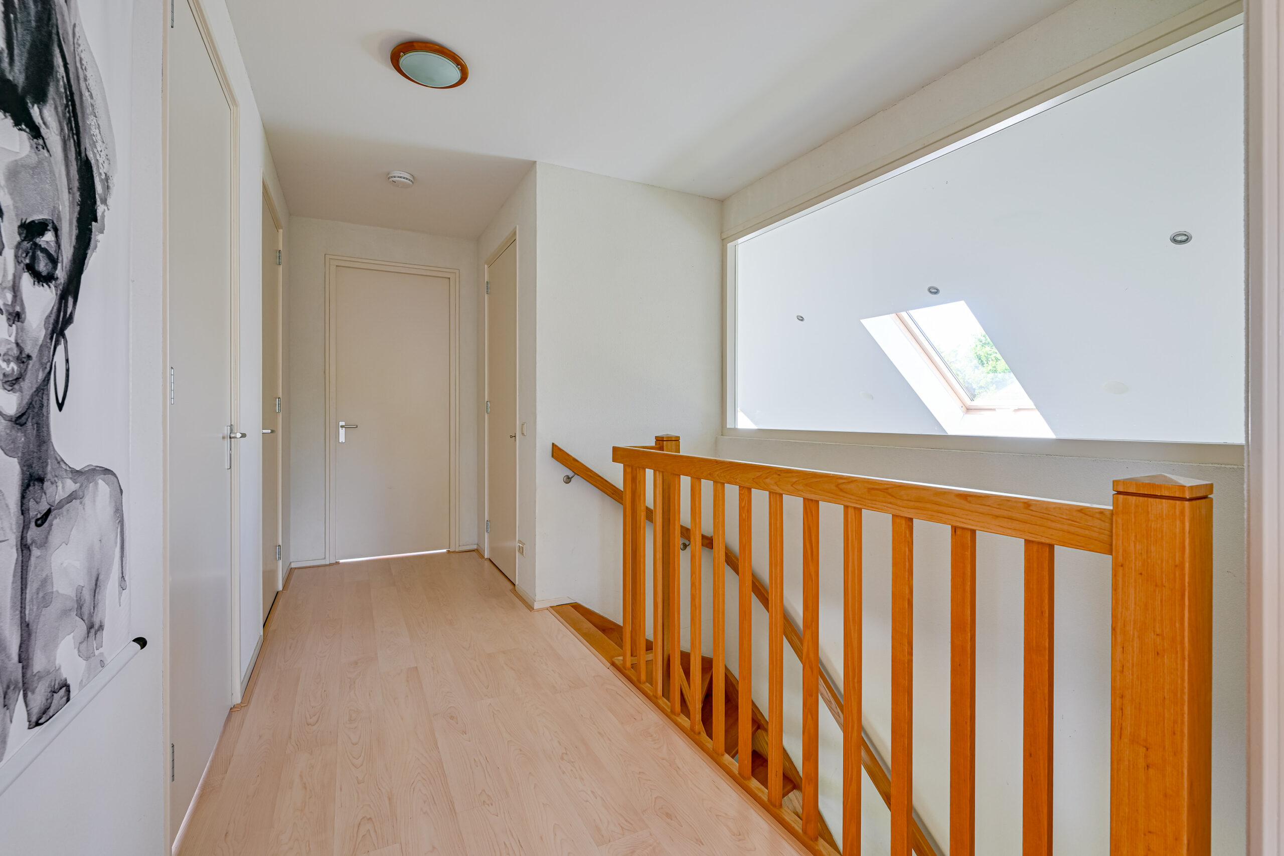 Verdieping: vide/overloop met bergkast, drie echt grote slaapkamers, waarvan 1 met inloopkast en de badkamer met douche, toilet en wastafelmeubel.