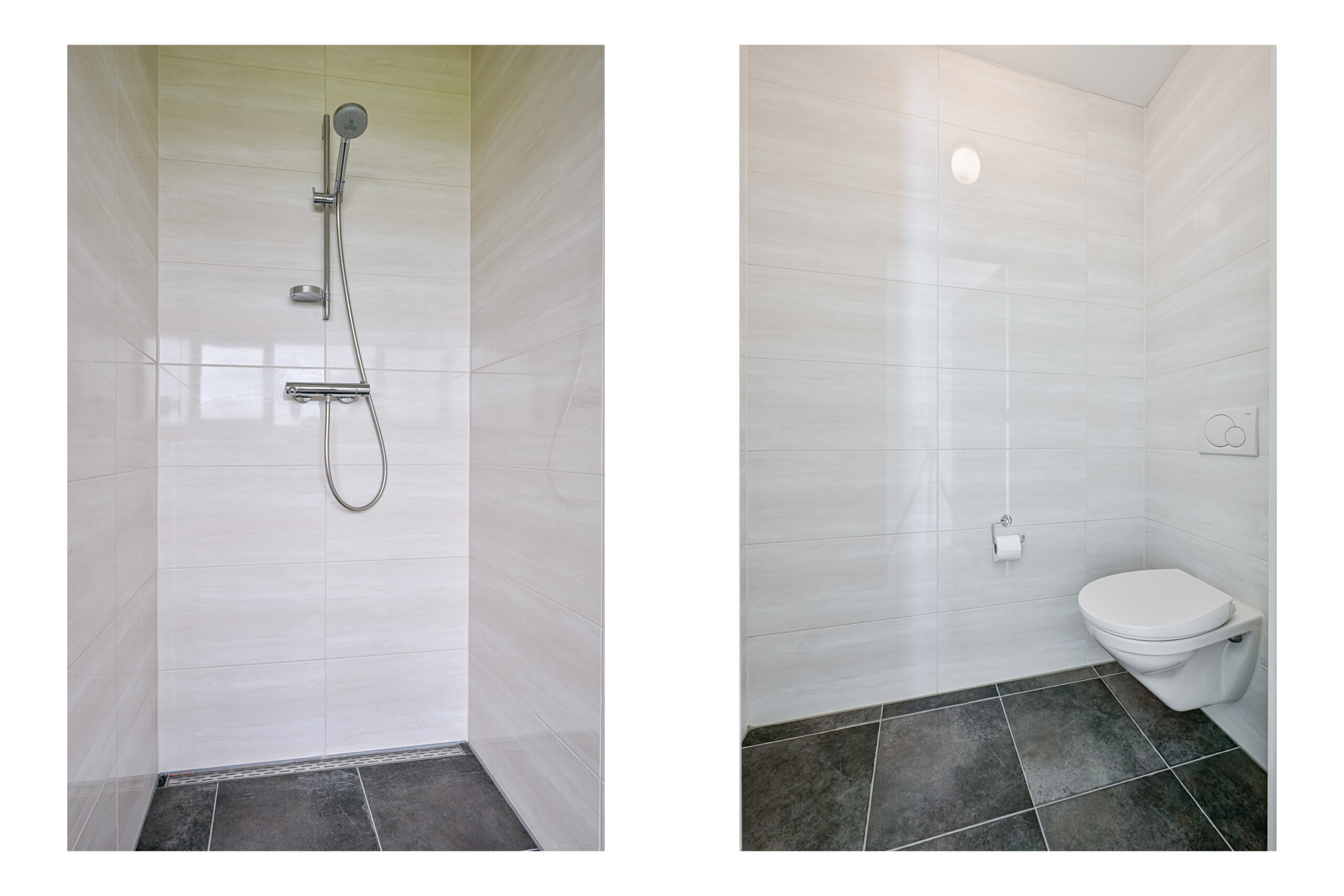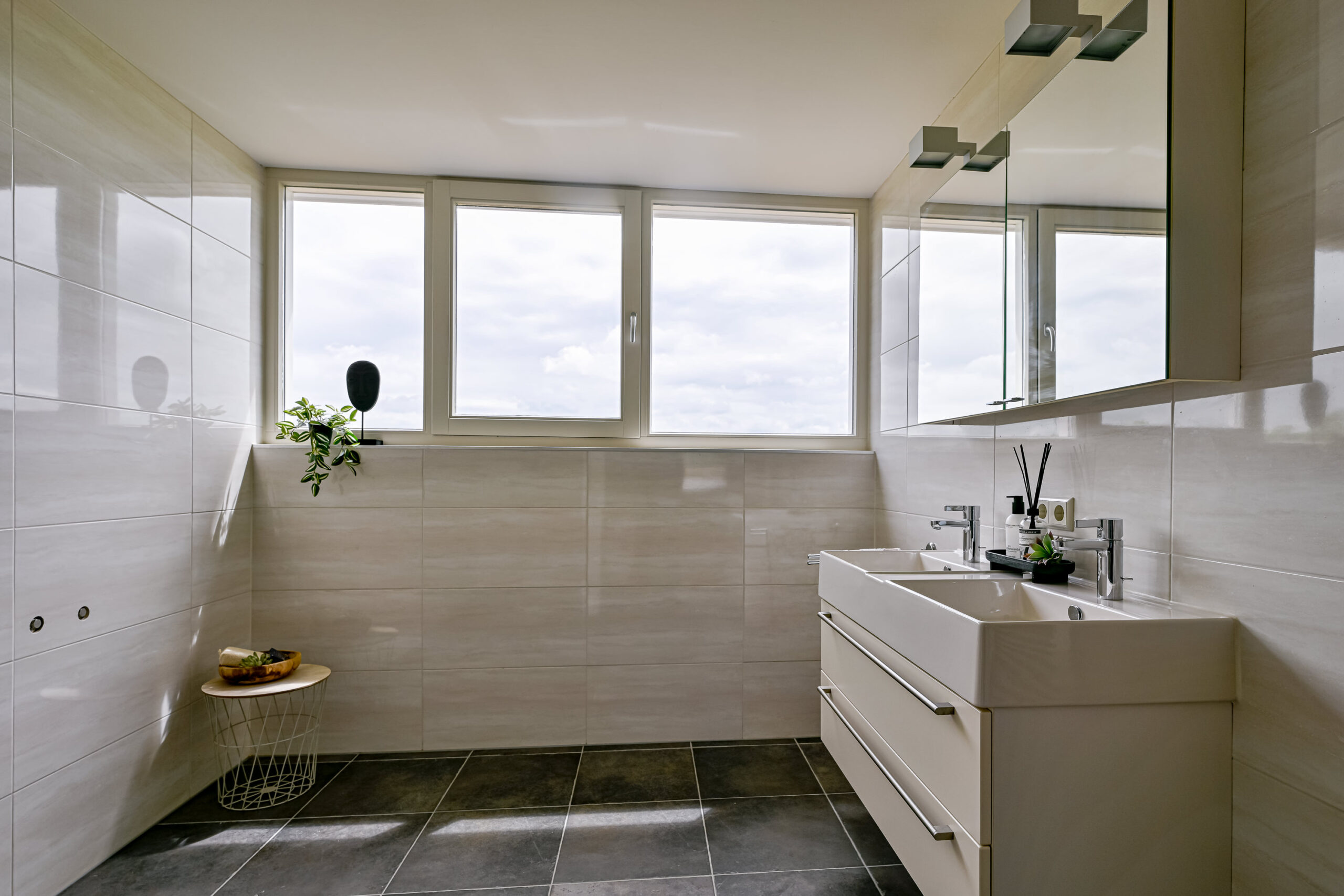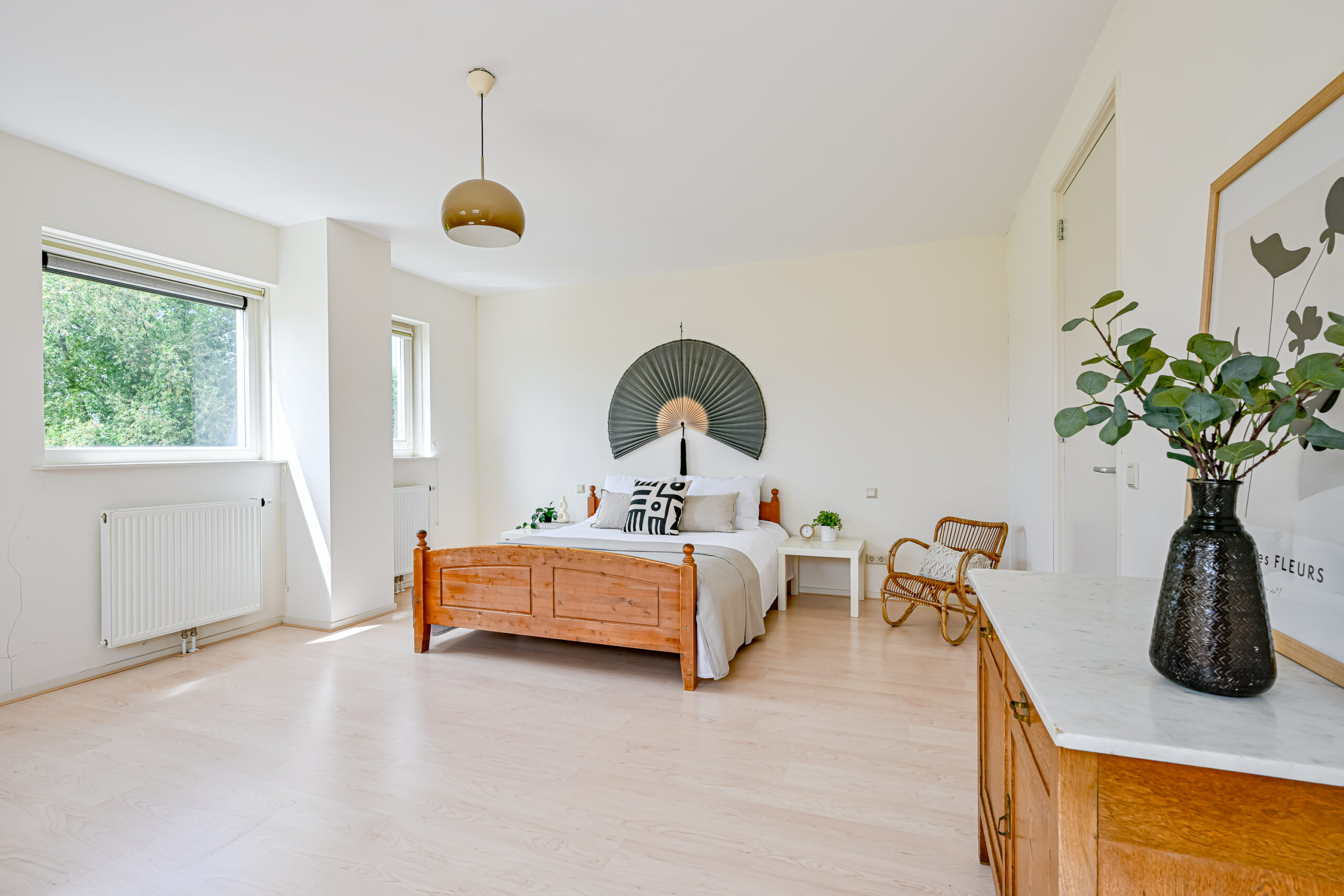 Verdieping: vide/overloop met bergkast, drie echt grote slaapkamers, waarvan 1 met inloopkast en de badkamer met douche, toilet en wastafelmeubel.