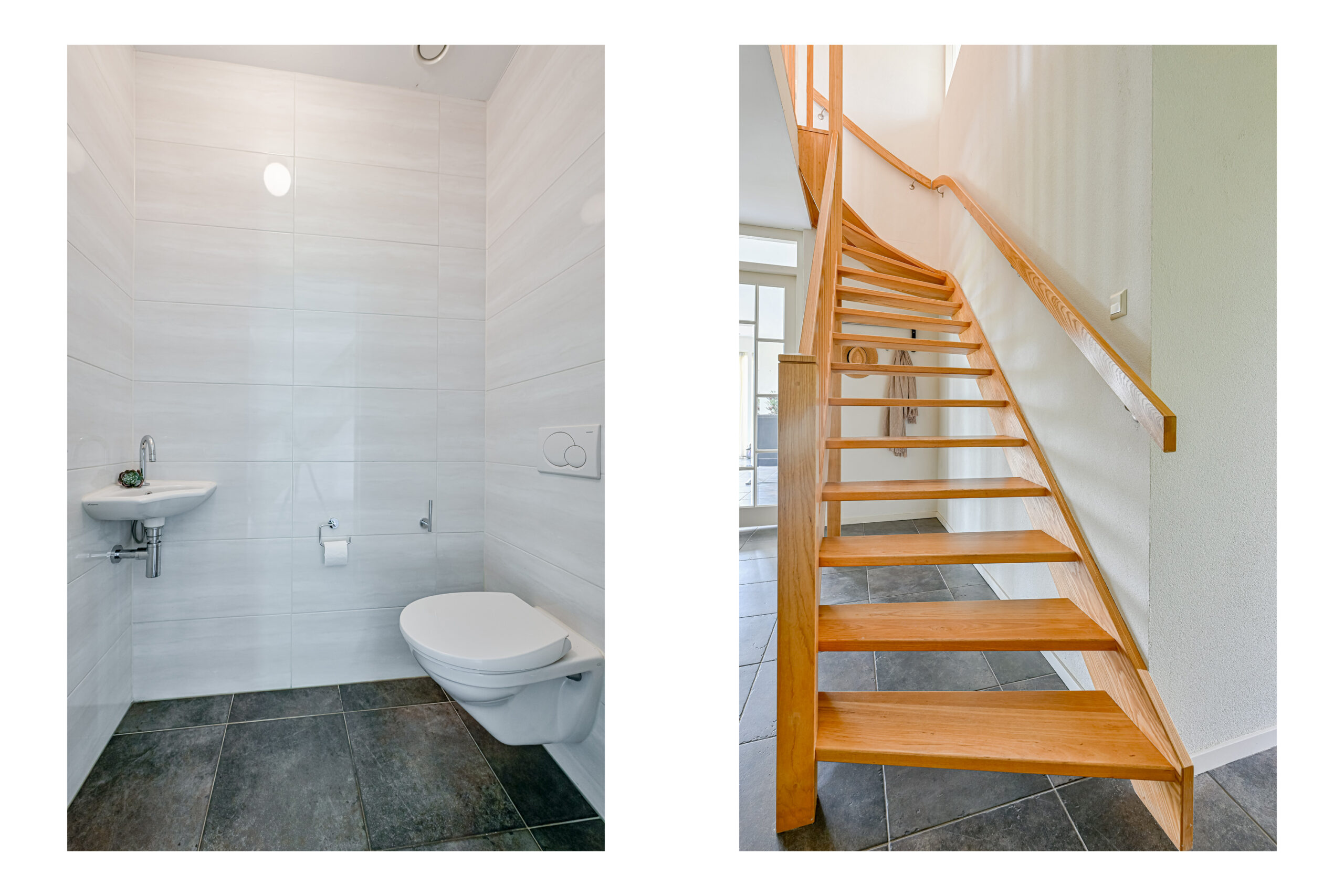 Indeling: ruime entreehal met de moderne toiletruimte en een robuuste trap naar verdieping.
