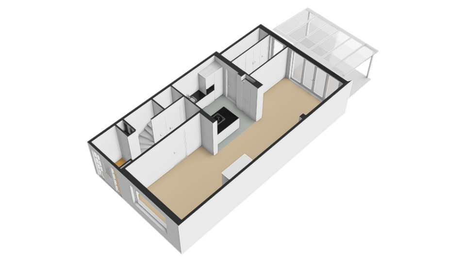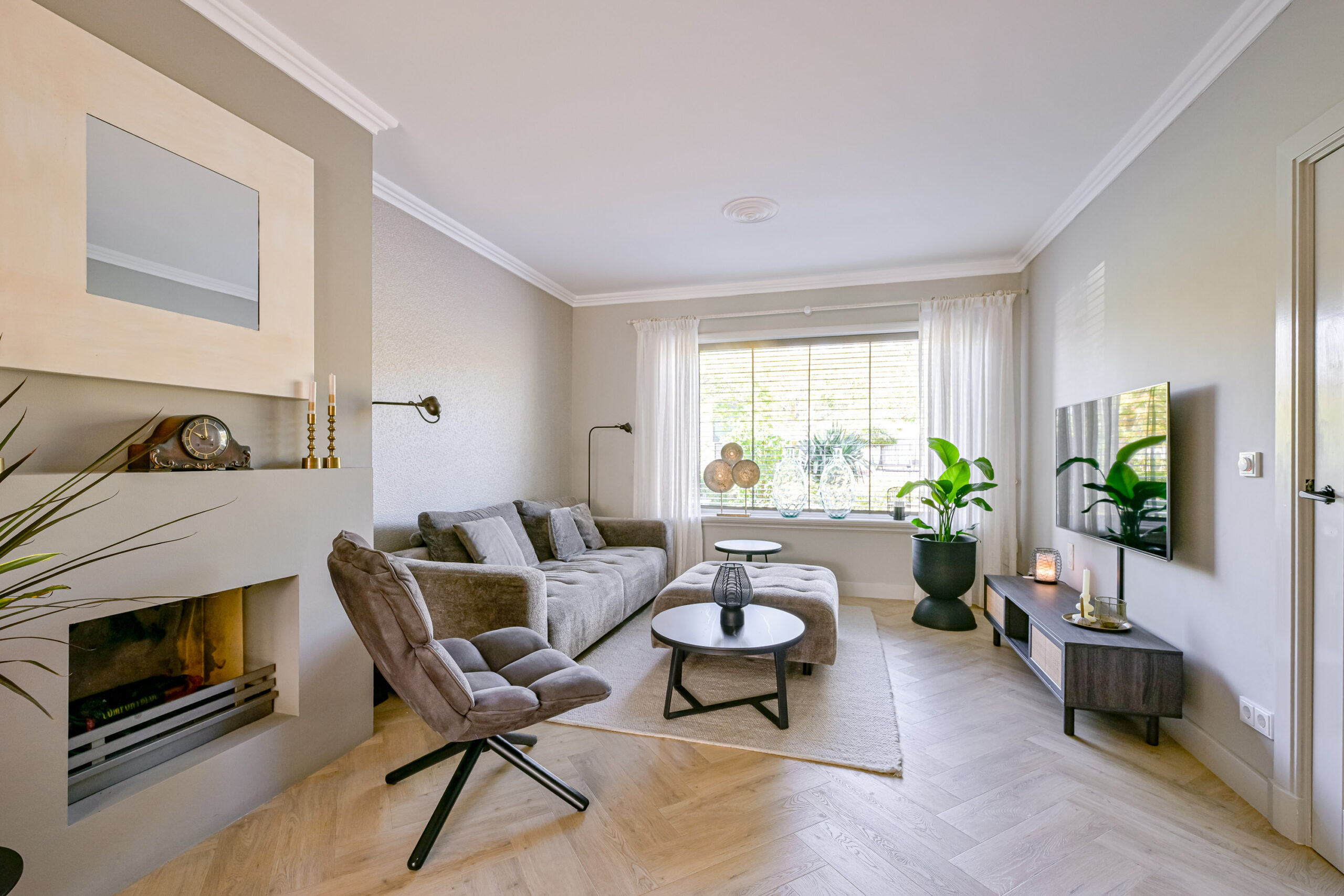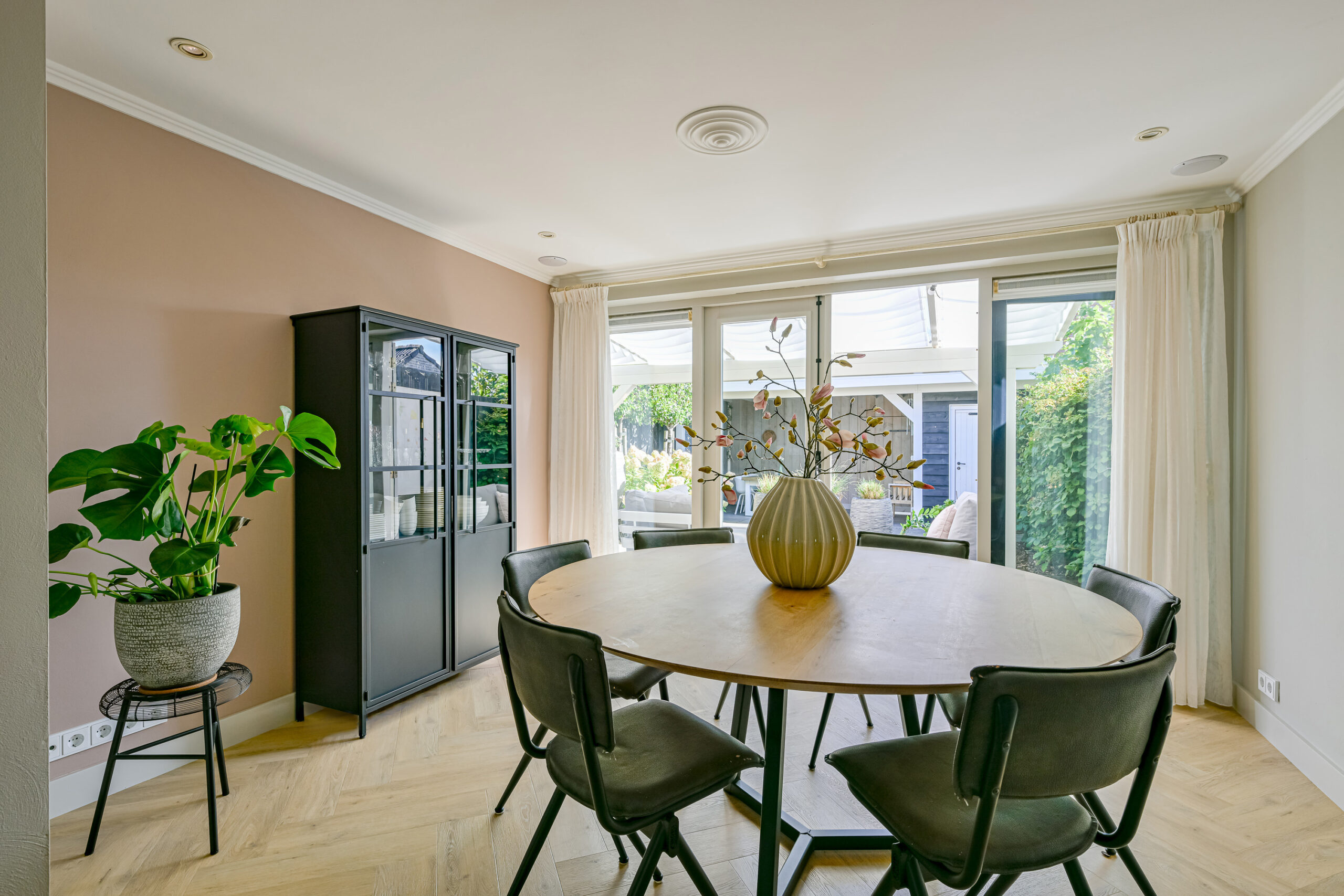 Aan de voorzijde van de woonkamer bevindt zich het zitgedeelte waar ruimte is voor een grote bank. De achterzijde is als eetgedeelte ingericht. Hier zijn dubbele tuindeuren geplaatst, waardoor veel licht in de woonkamer komt en er mooi zicht is op de tuin met aangebouwde overkapping en robuuste veranda met berging. De luxe keuken is voorzien van alle gemakken zoals quookerkraan, vaatwasser, inductie koken met geïntegreerde afzuiging, koelkast en vriezer.